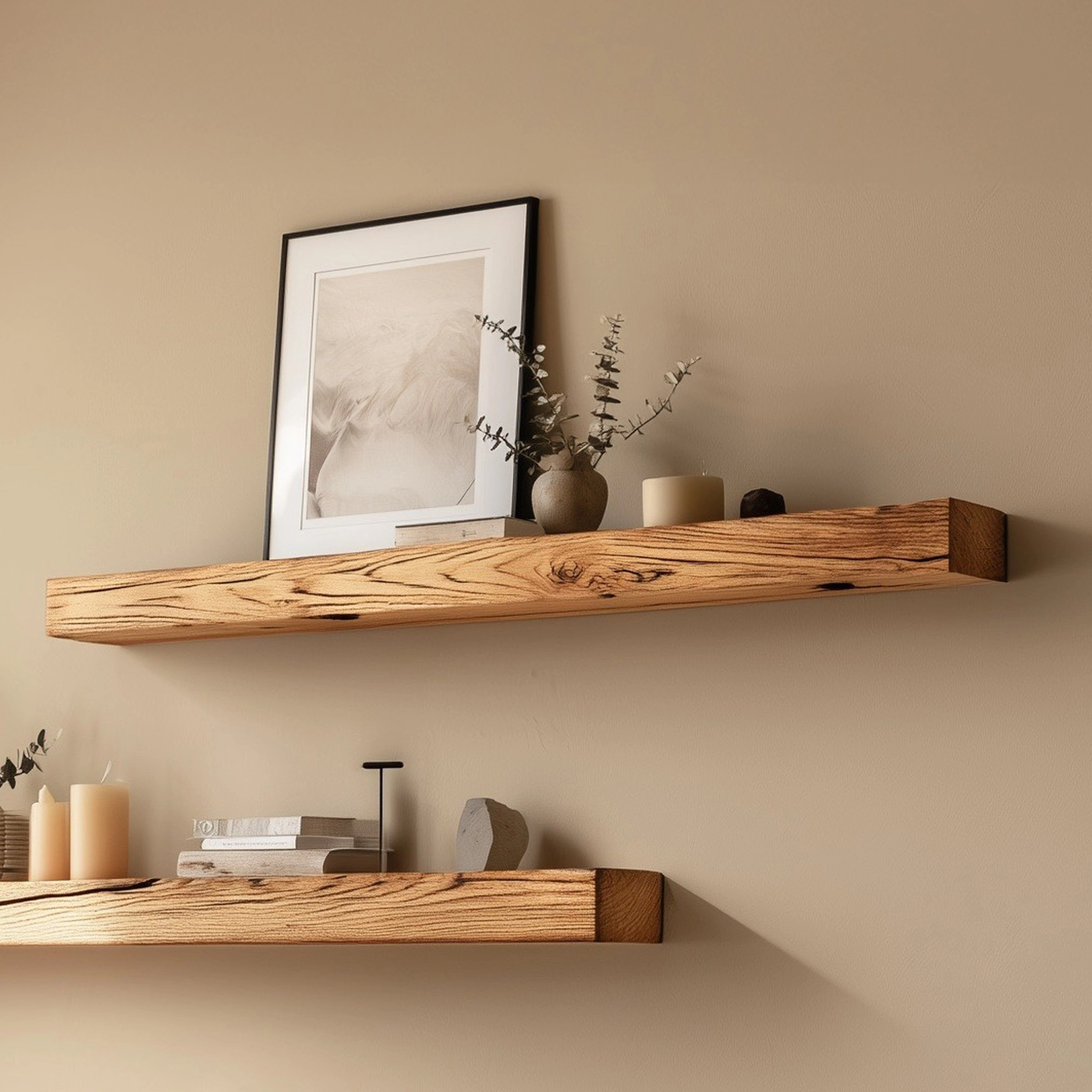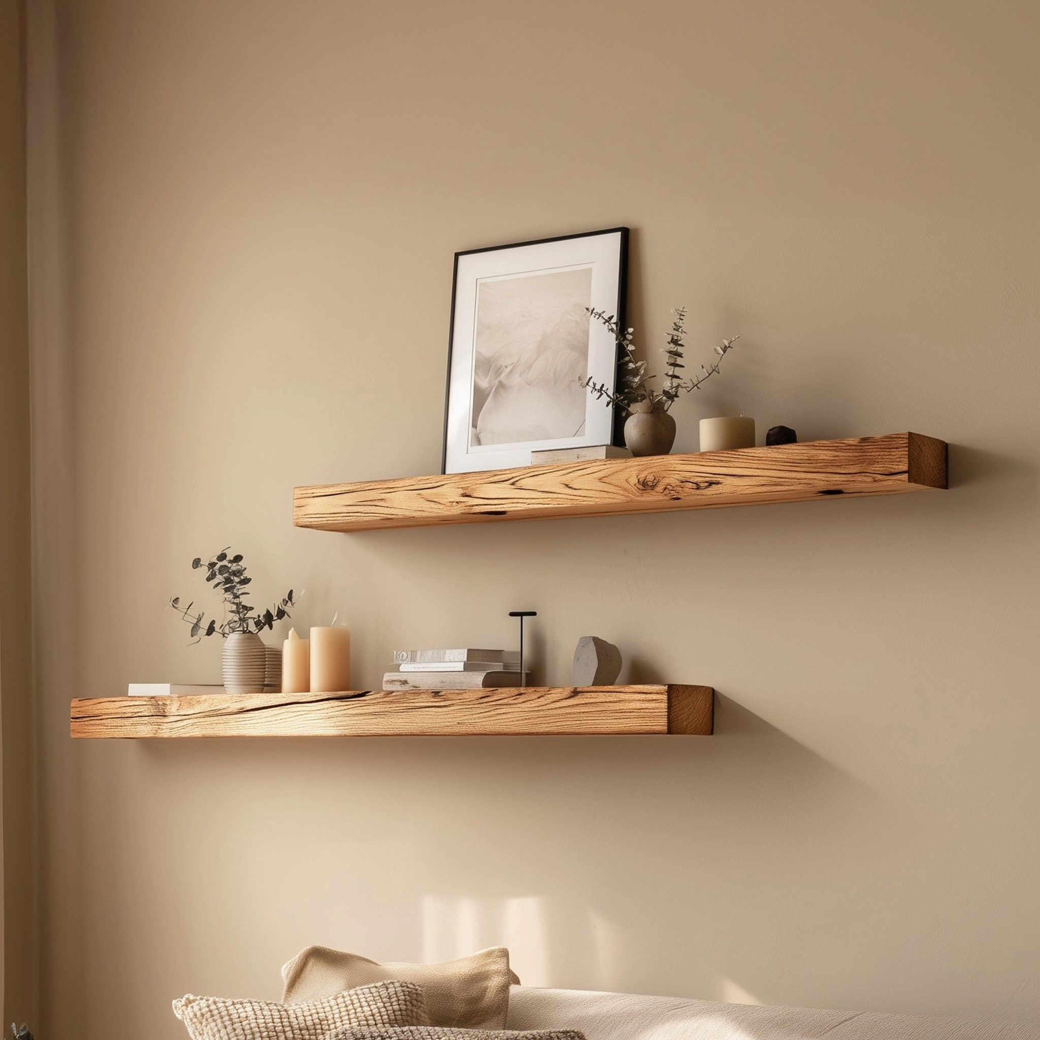 Suitable for framed artwork, books, candles, and small decorative accents, these shelves support curated styling in living rooms, bedrooms, or reading areas. Multiple shelves can be arranged together to create visual rhythm along the wall.