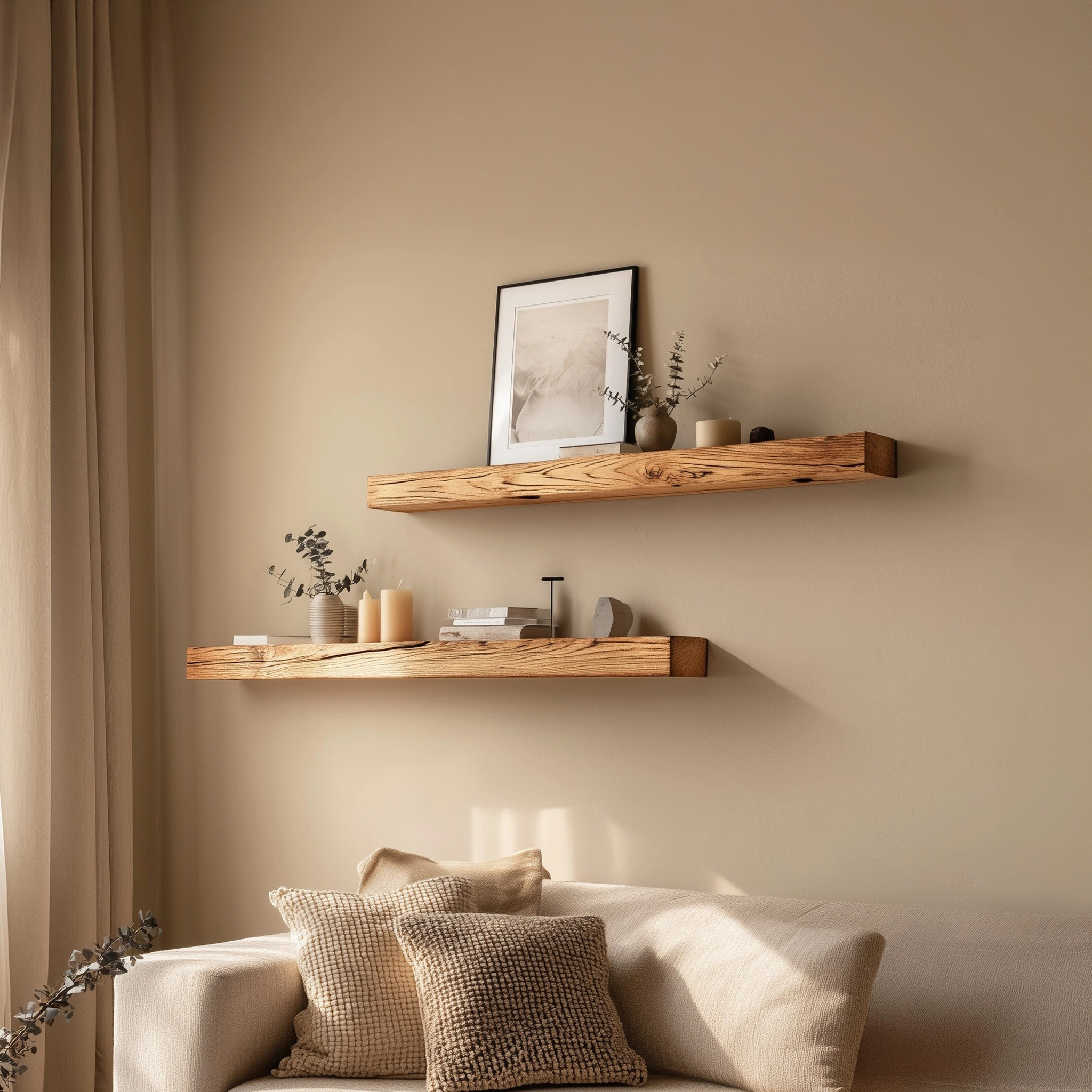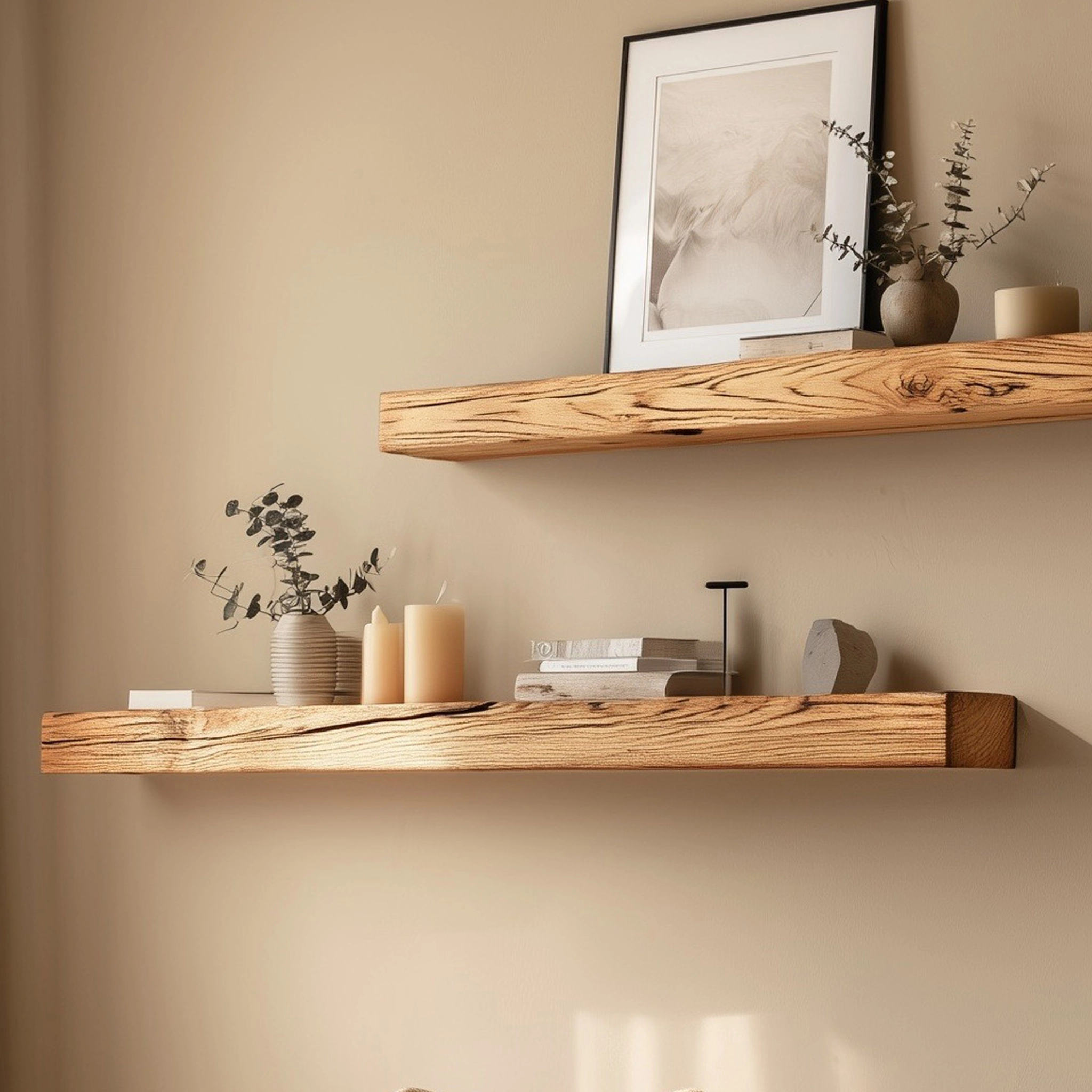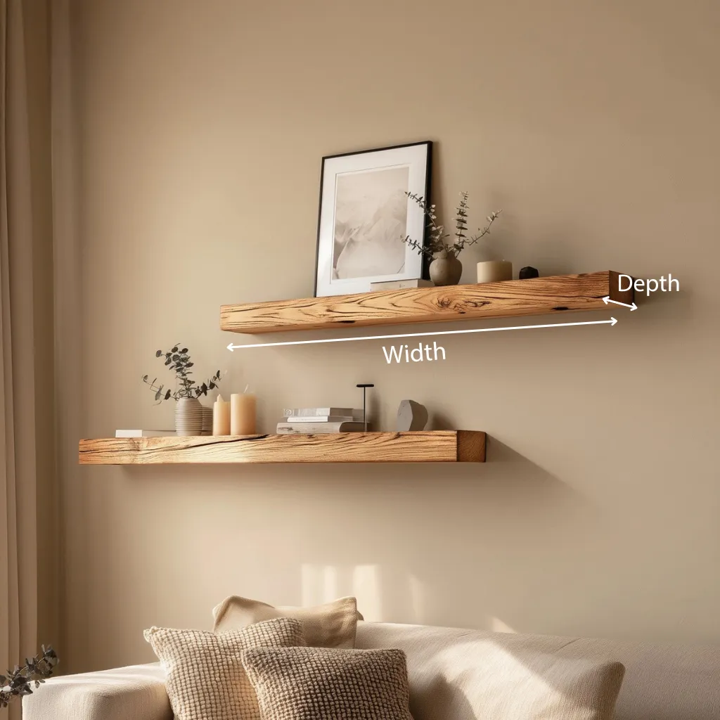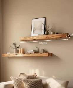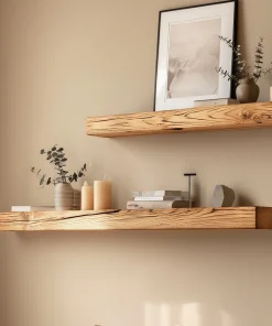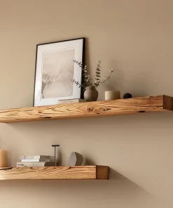 Minimal wooden floating shelves designed for quiet wall styling and balanced display.
