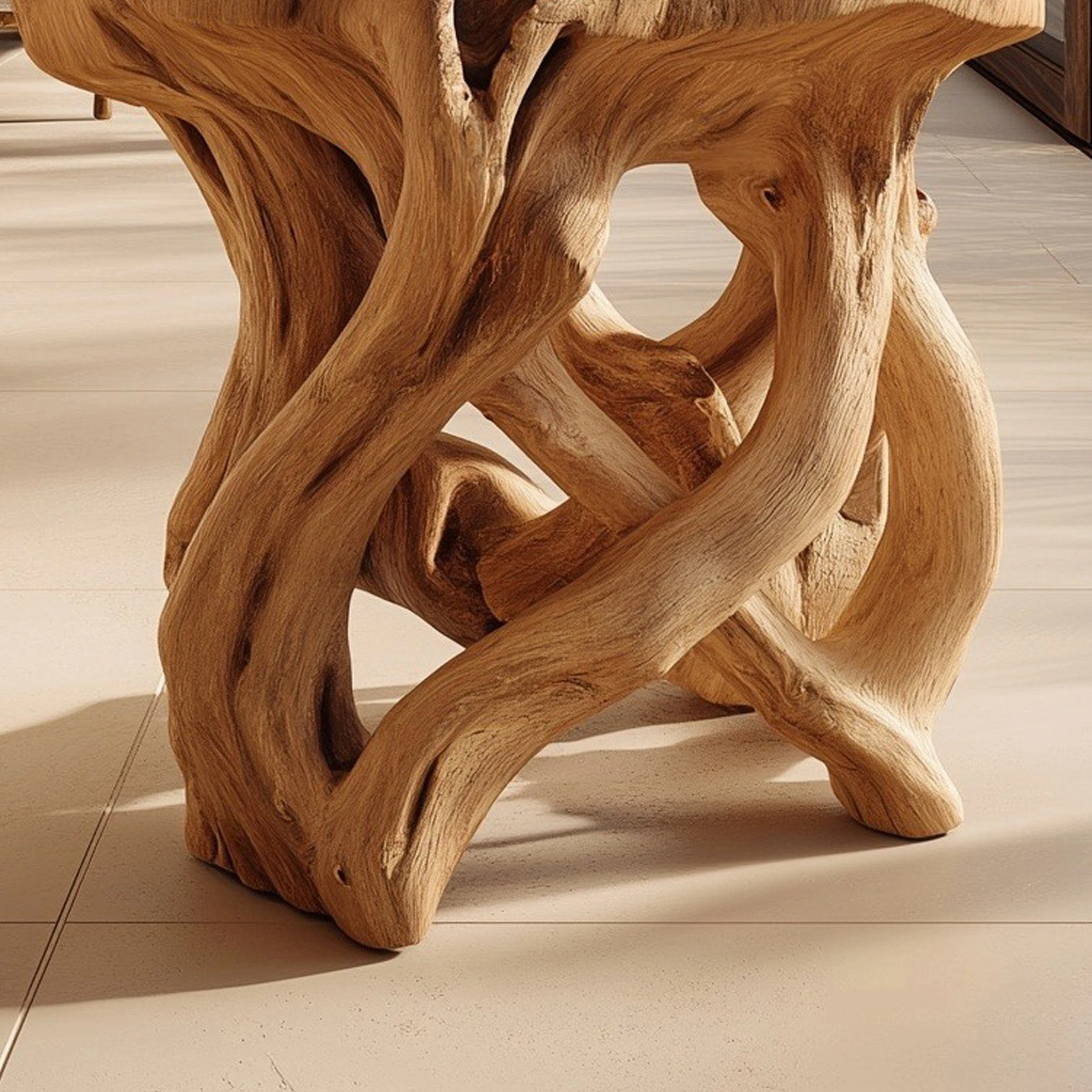 The base is formed by multiple curved supports that intersect and twist naturally, creating an open and visually dynamic silhouette. Each angle reveals a different perspective, making the table engaging from all sides.