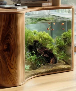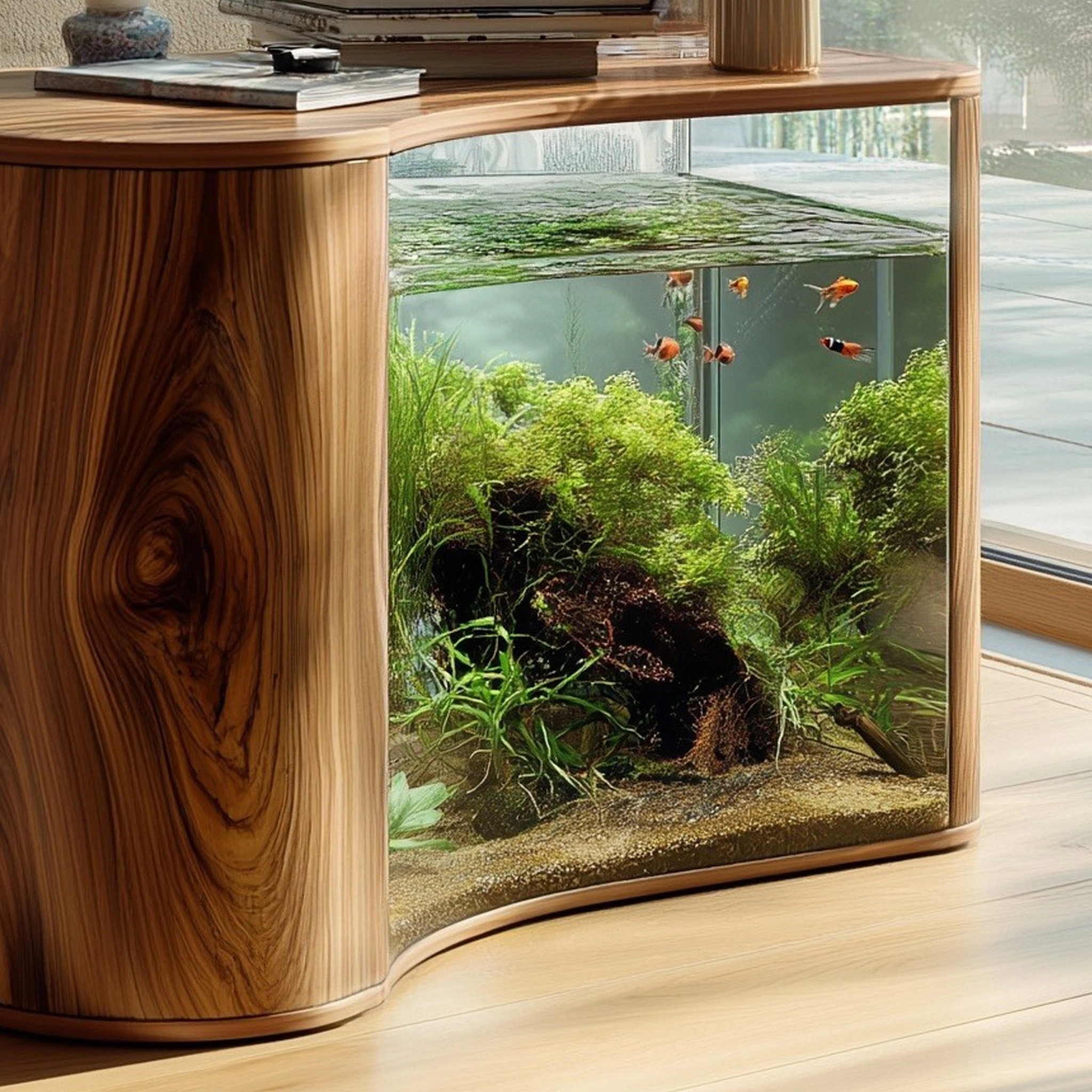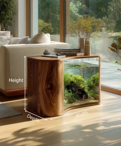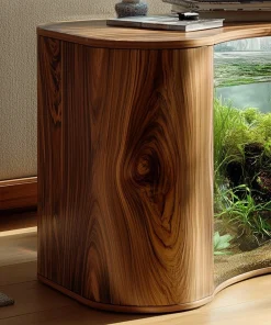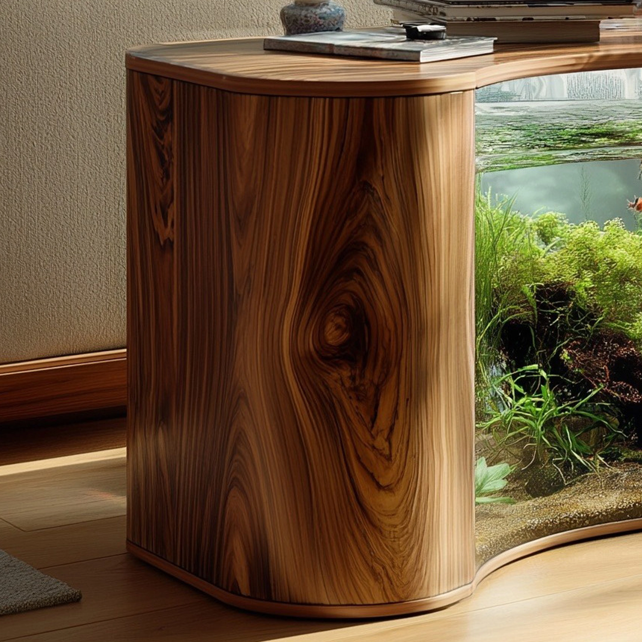 The Curved Wooden Aquarium Side Console Table is designed as a multifunctional accent piece that combines a tabletop surface with an integrated glass aquarium. Its flowing silhouette and compact footprint make it suitable for placement beside sofas, seating areas, or windows.