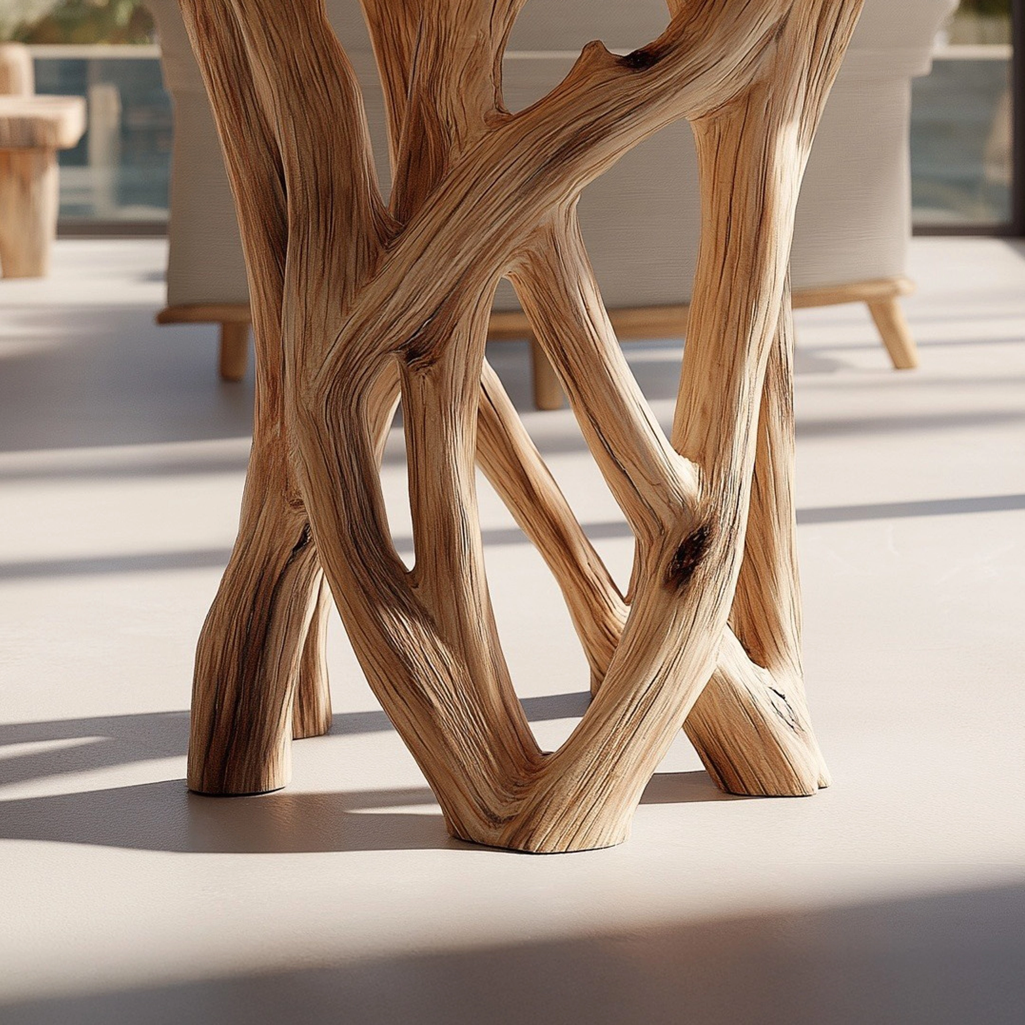 The base is formed by multiple solid wood elements that intersect and support one another, creating a sense of movement and architectural tension. Each angle reveals a different profile, encouraging the piece to be viewed from all sides.