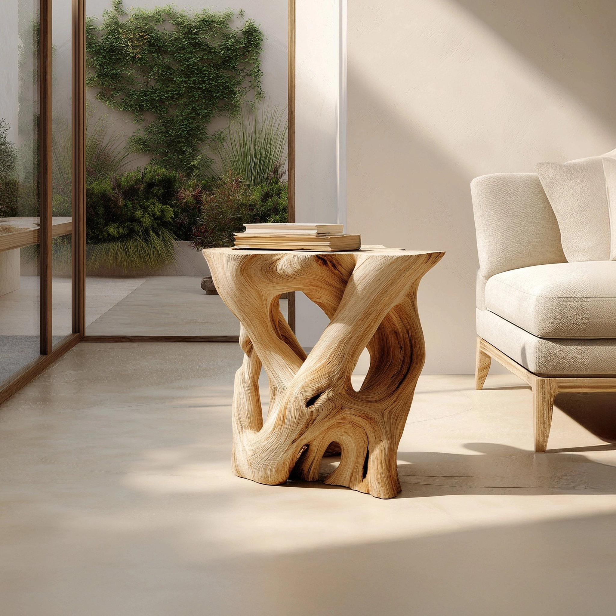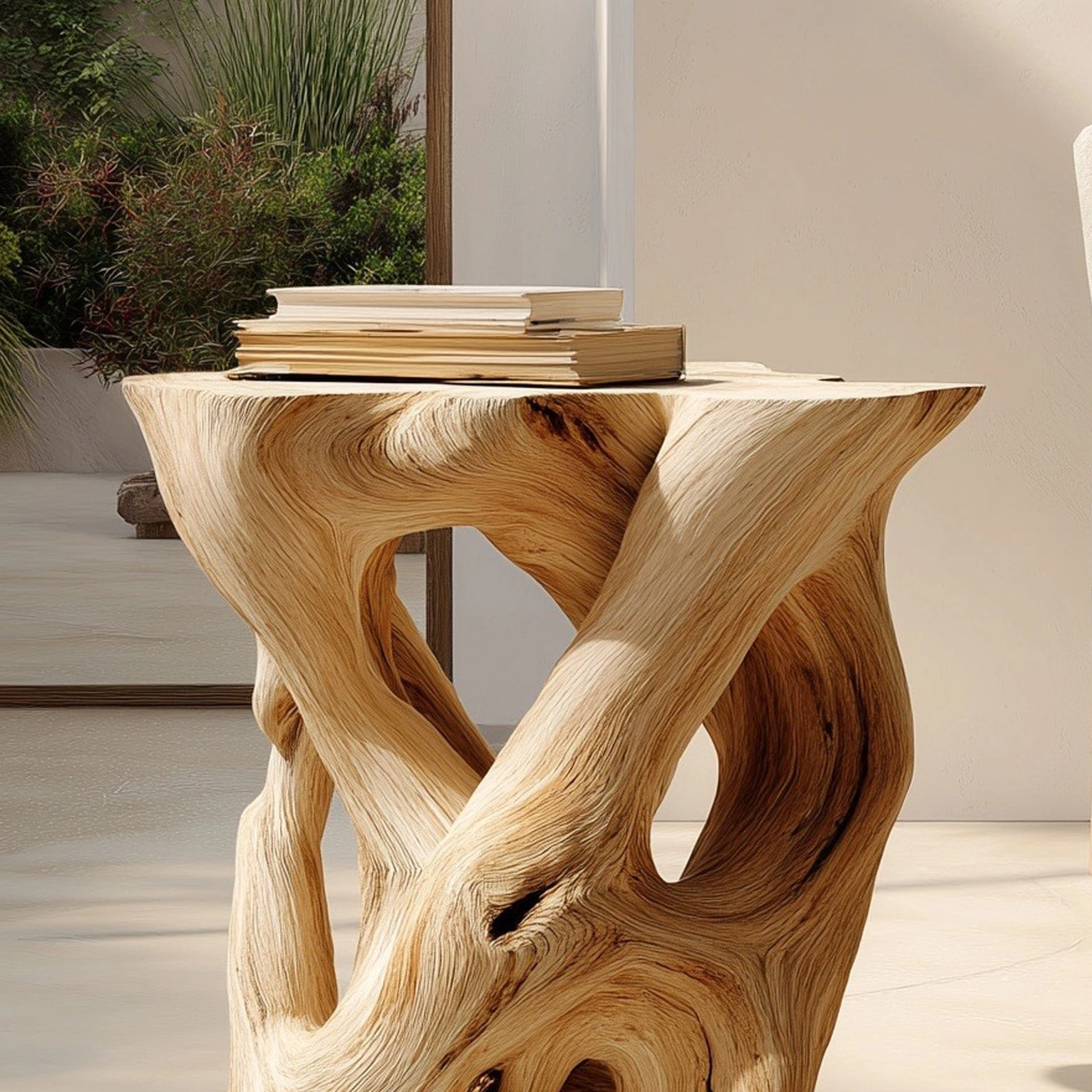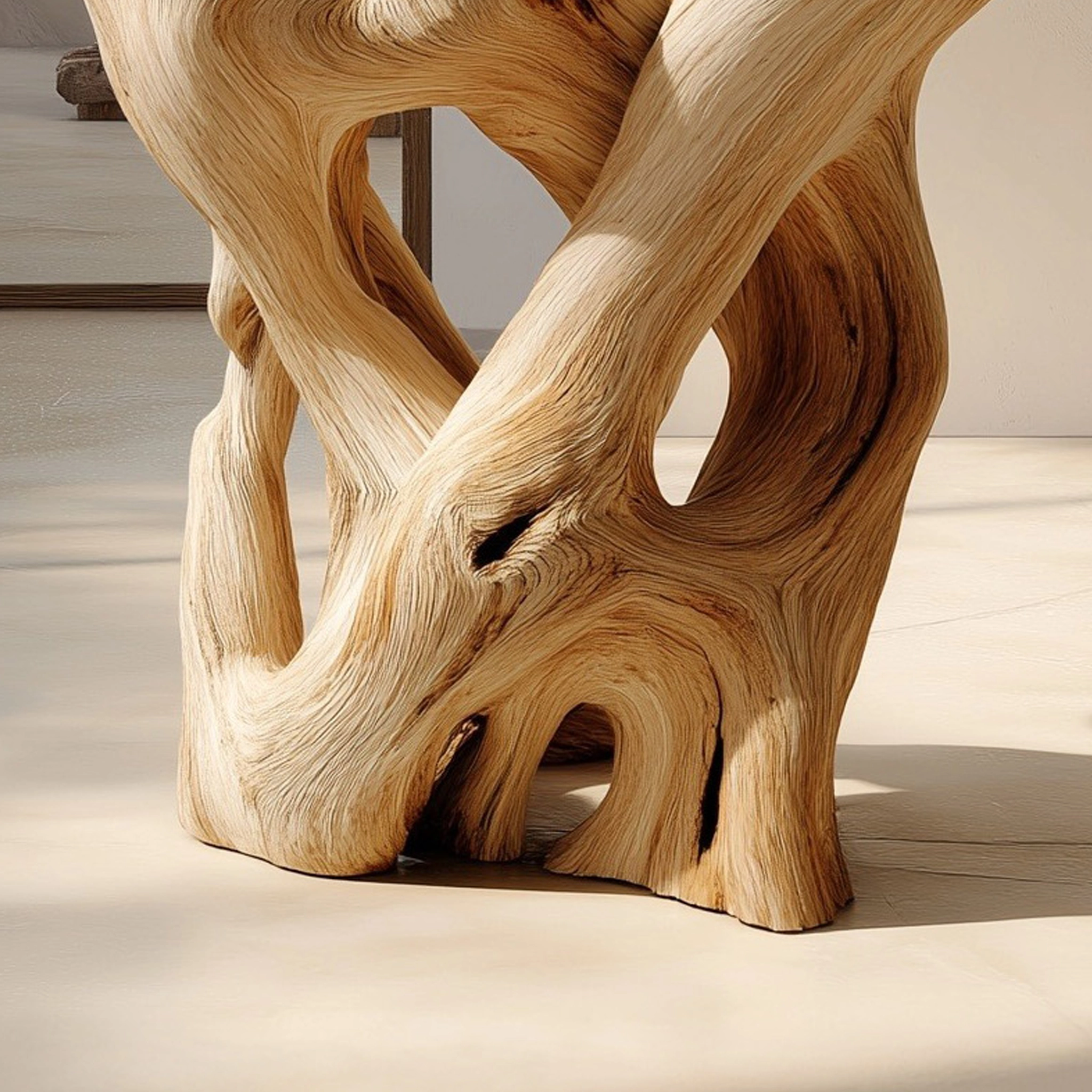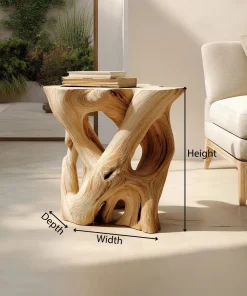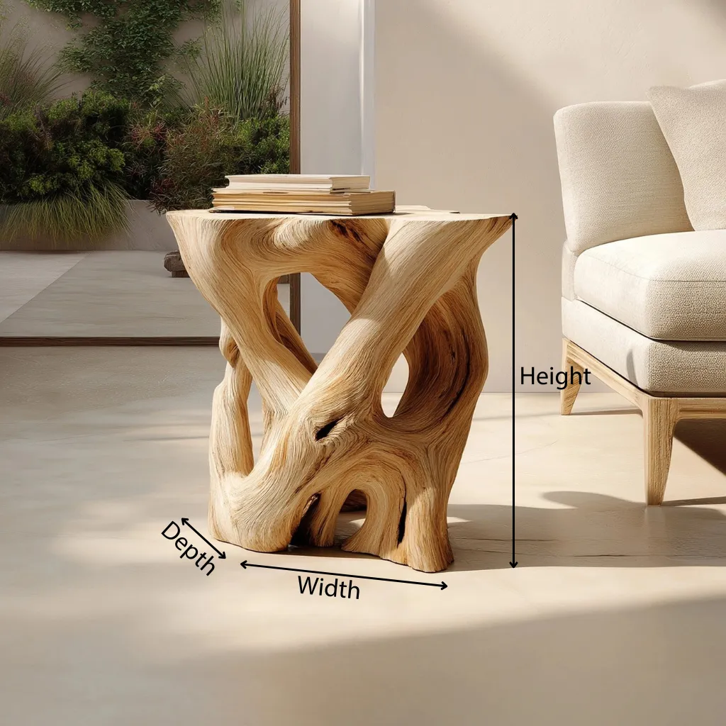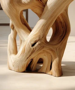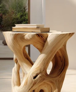 The Interwoven Sculptural Wooden Side Table with Organic Form Base is designed as a functional surface paired with an expressive, art-like structure. The piece balances utility and visual interest, making it suitable as an accent table within contemporary living spaces.