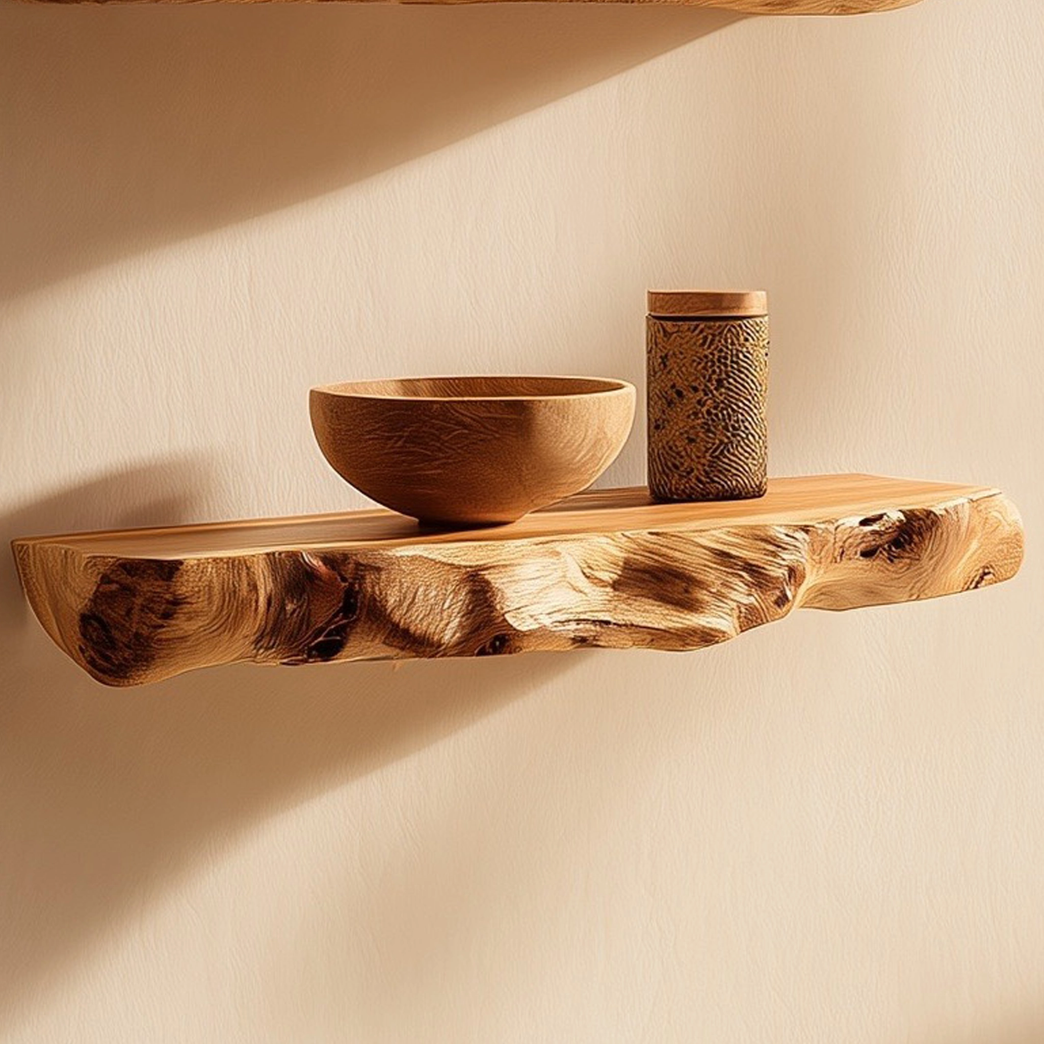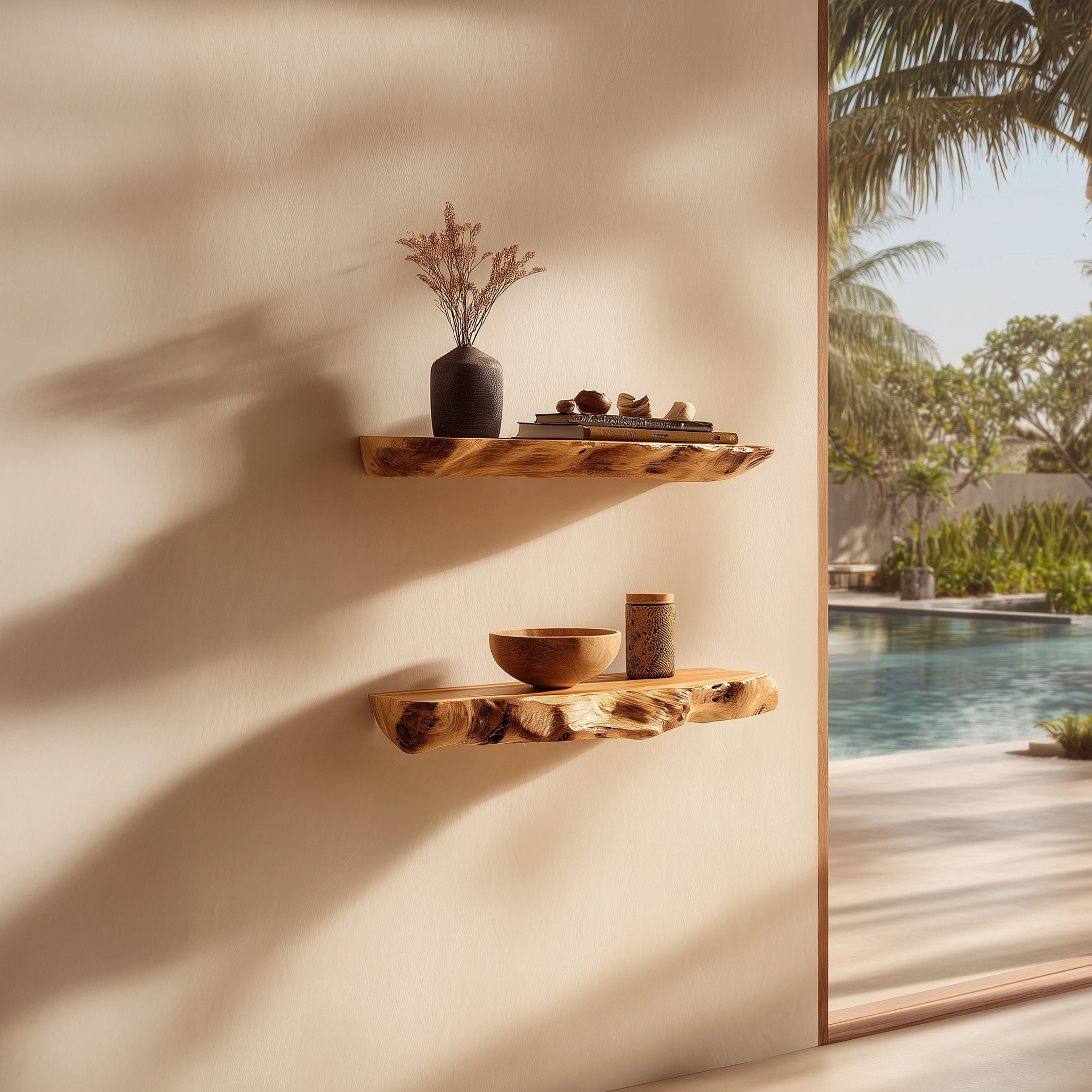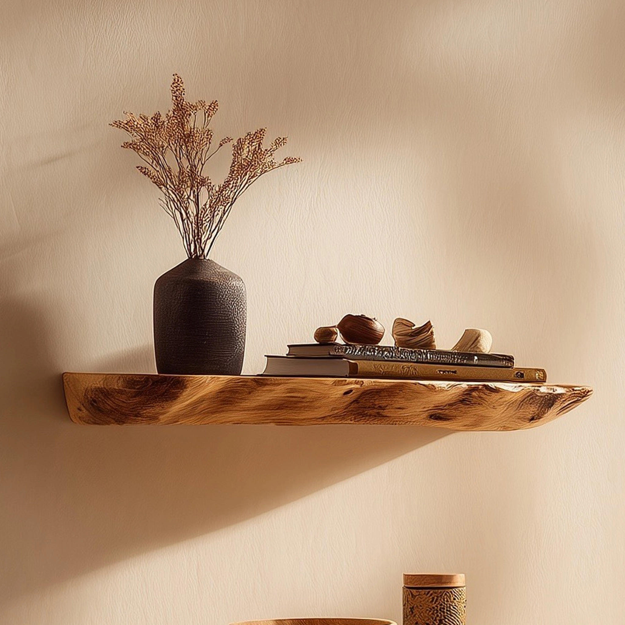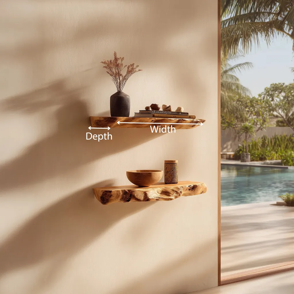 Floating wooden wall shelves with softly irregular edges for warm, natural wall styling.