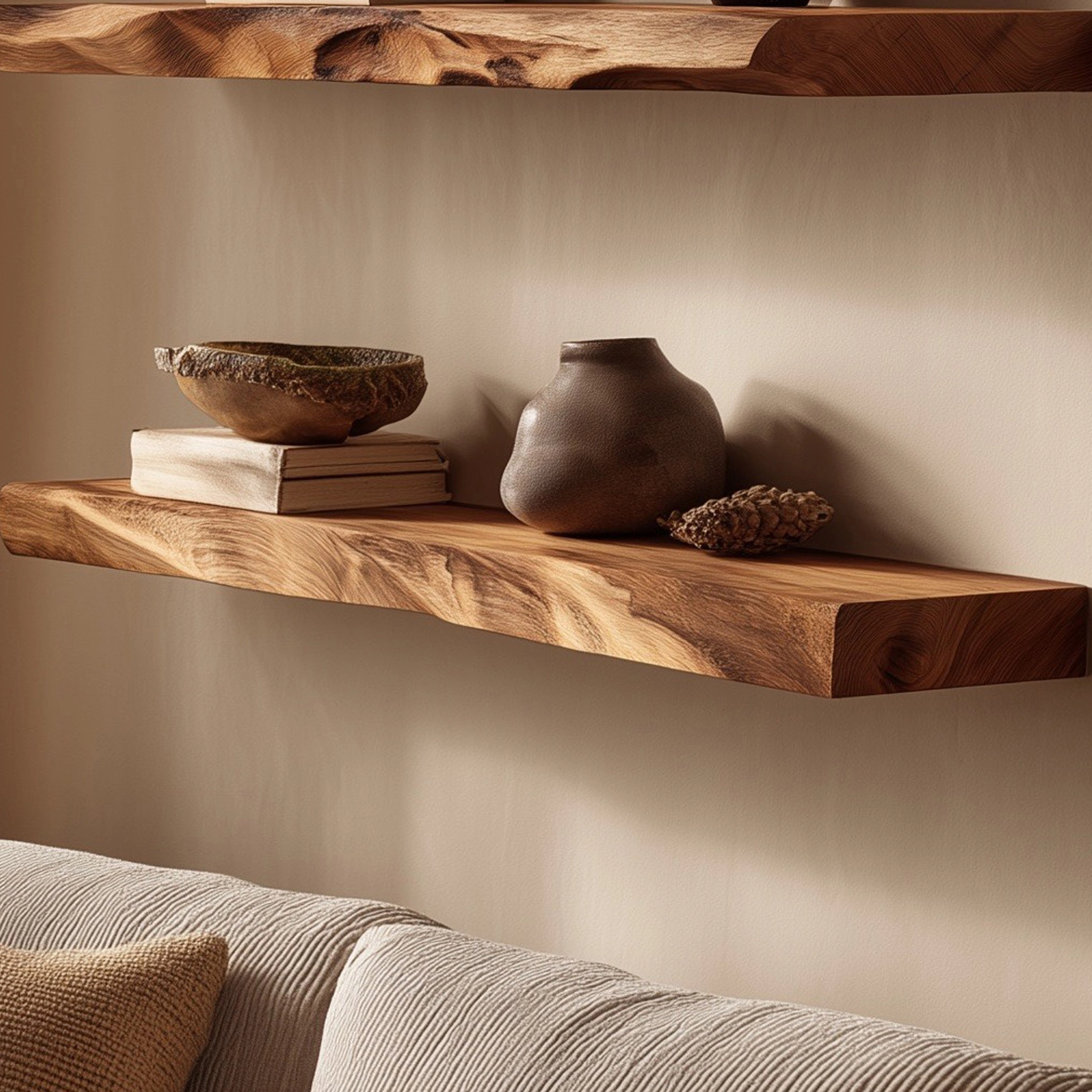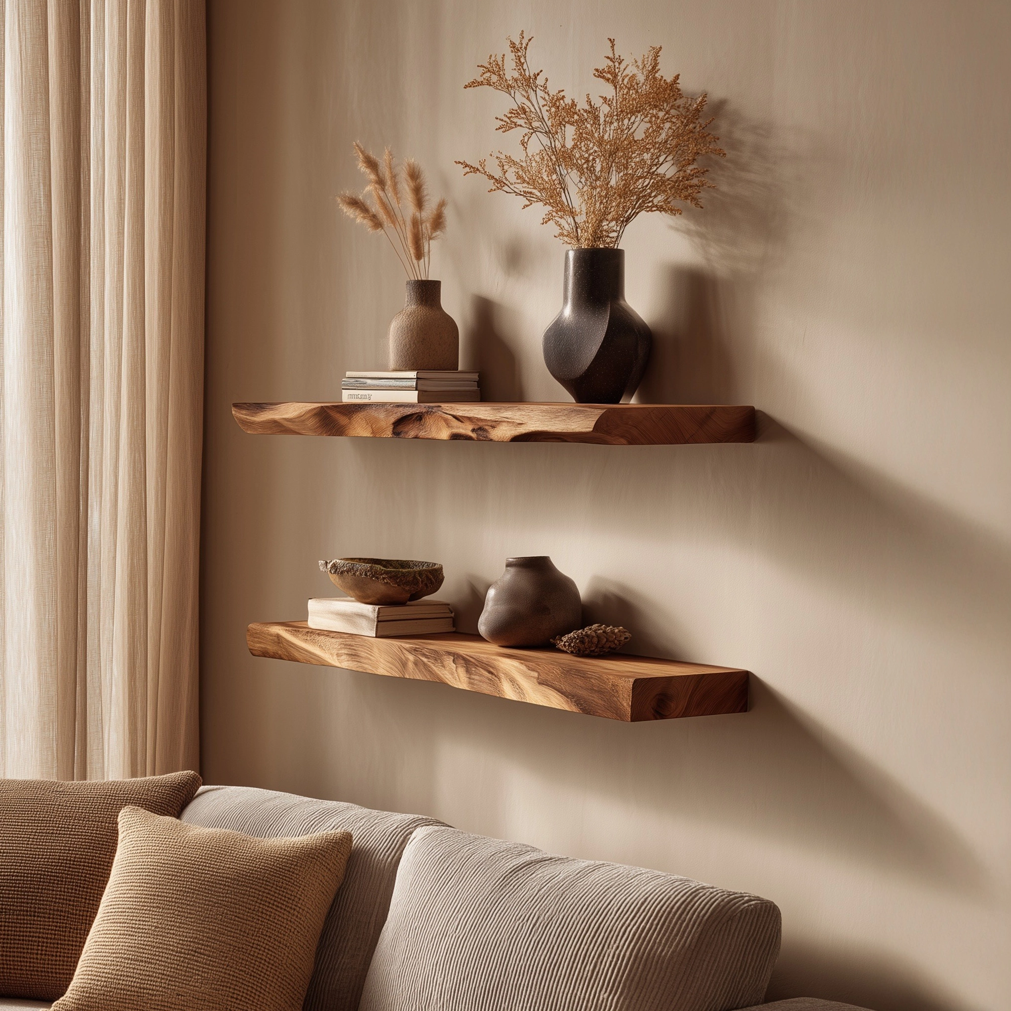 Floating wooden shelves featuring softly contoured edges and balanced proportions.