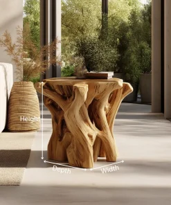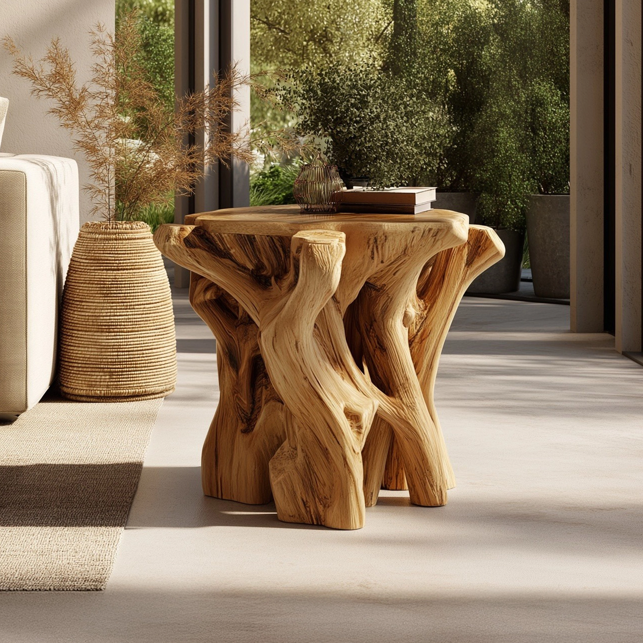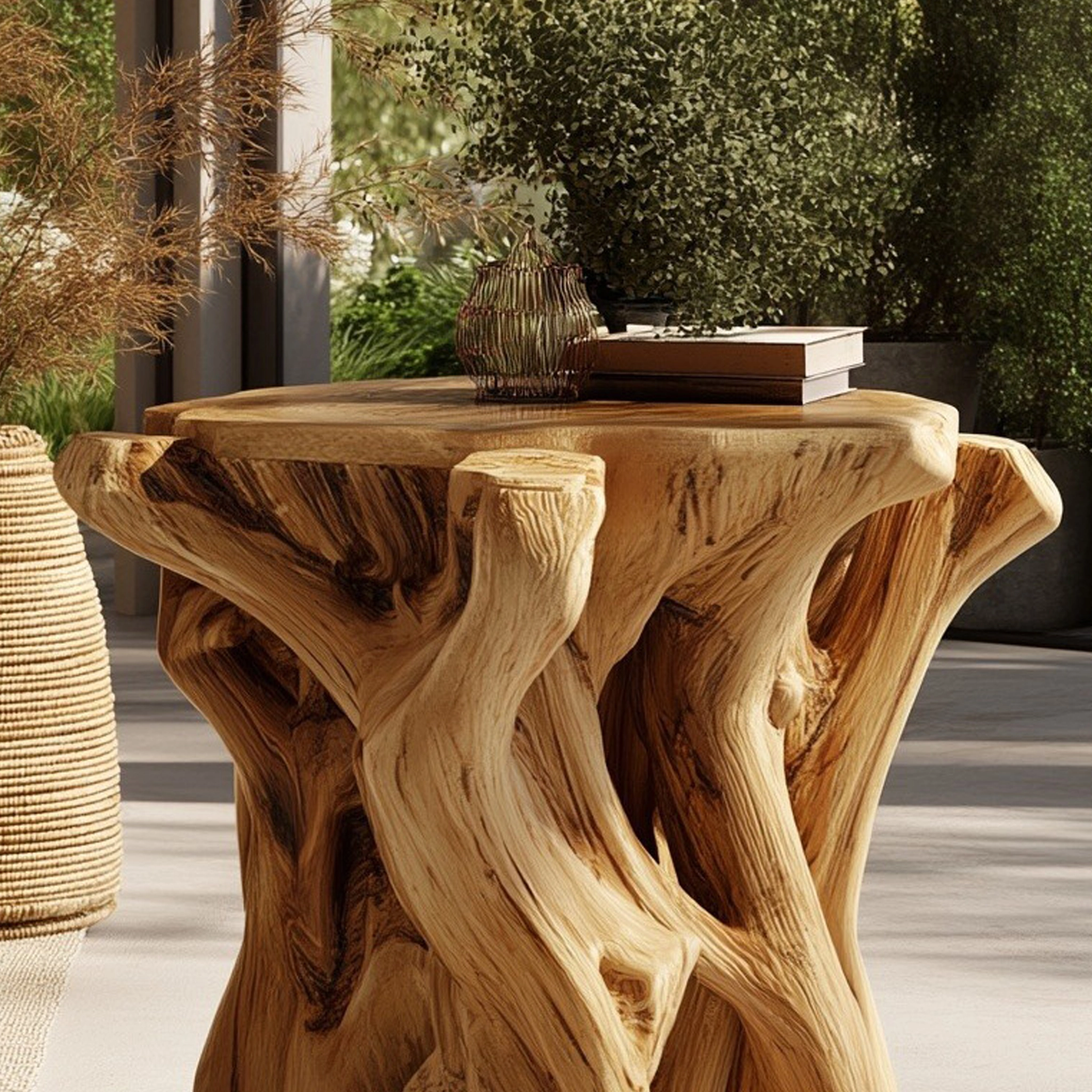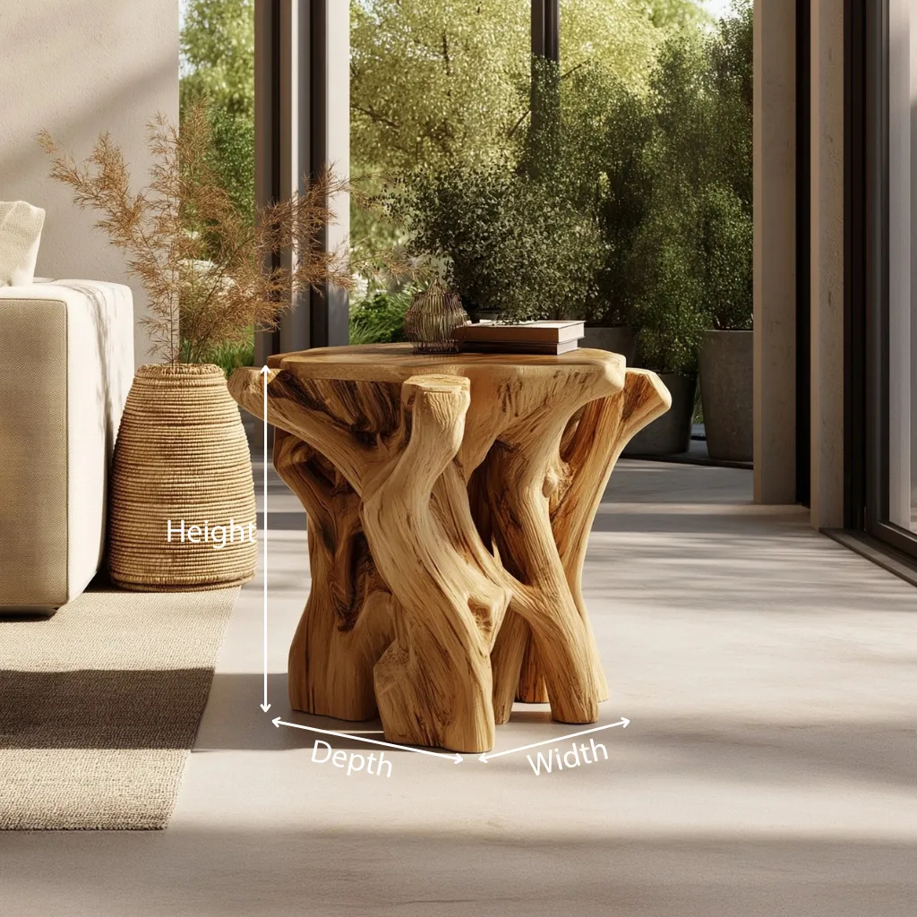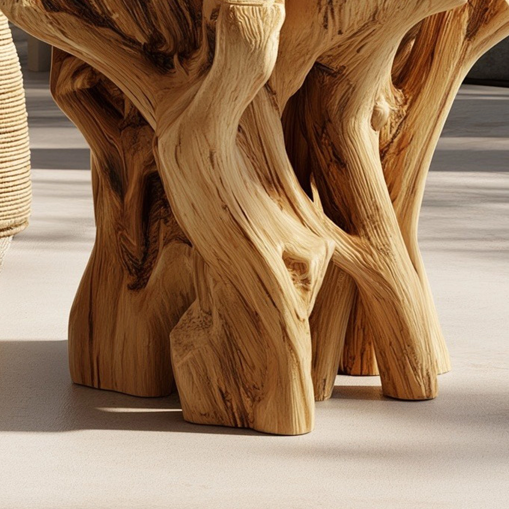 The Rooted Arc Wooden Sculptural Side Table is conceived as a balance between solid structure and flowing movement. Its design highlights curved supports that rise from the base and connect seamlessly to a smooth circular tabletop.