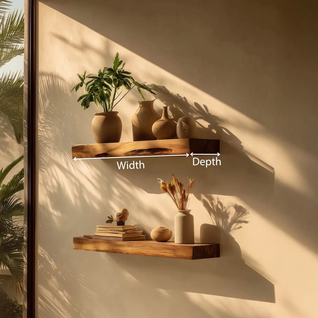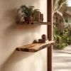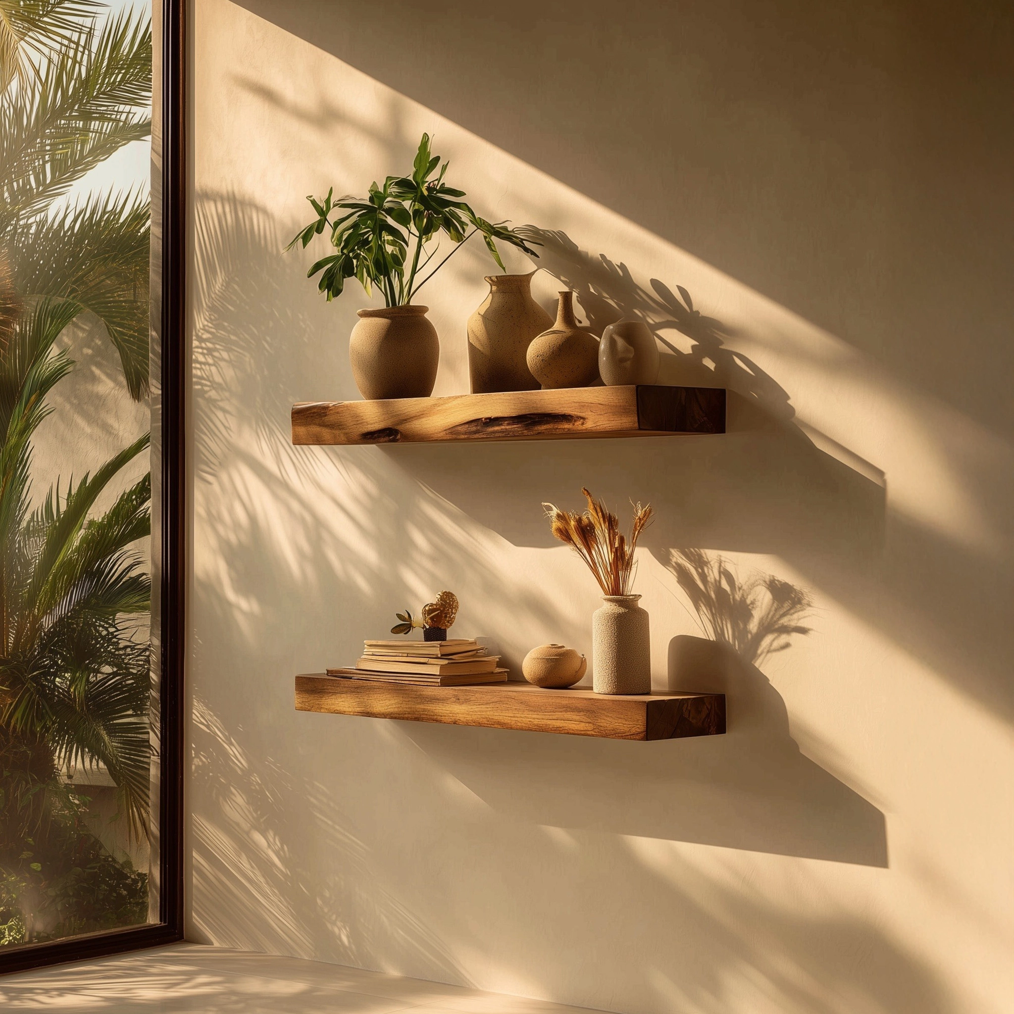 Floating wooden shelves highlighting warm grain tones and clean, grounded proportions.