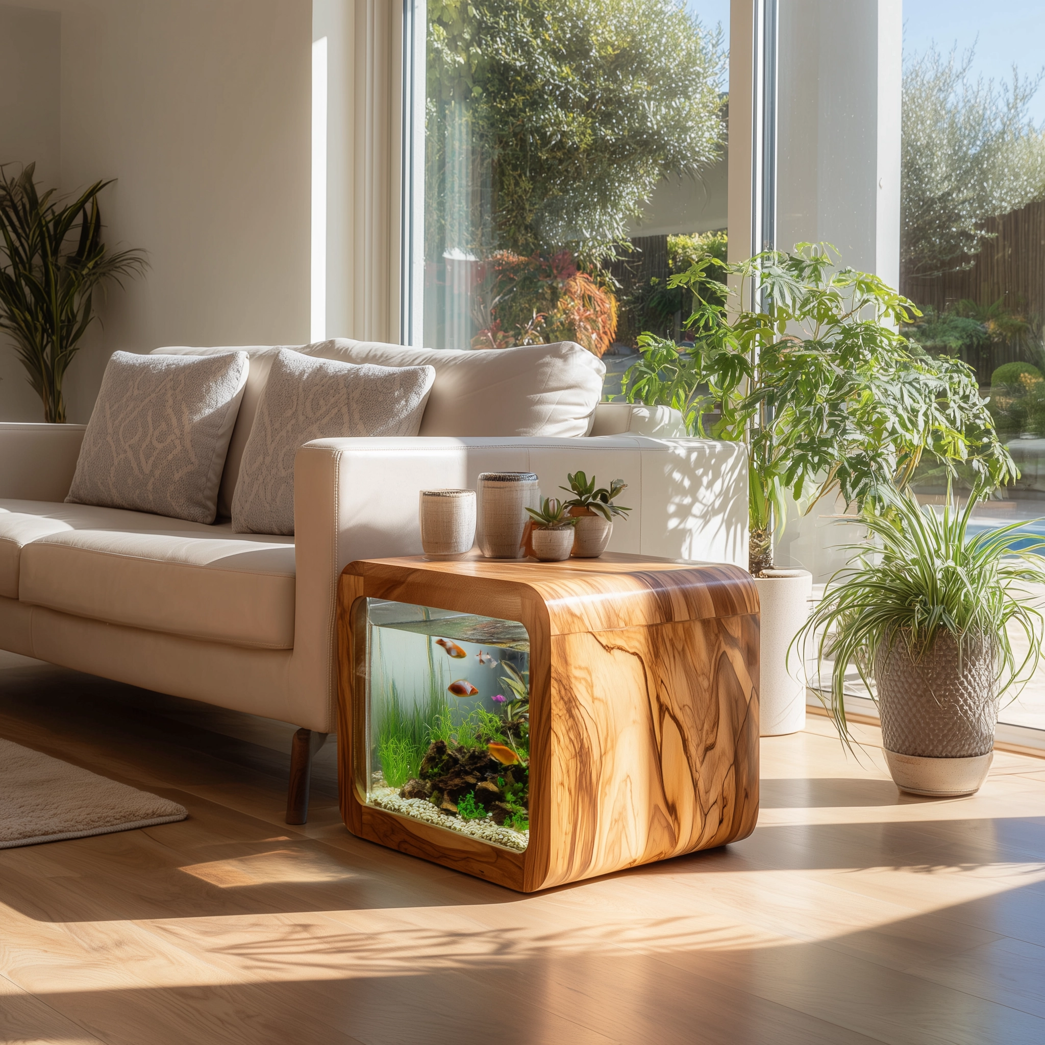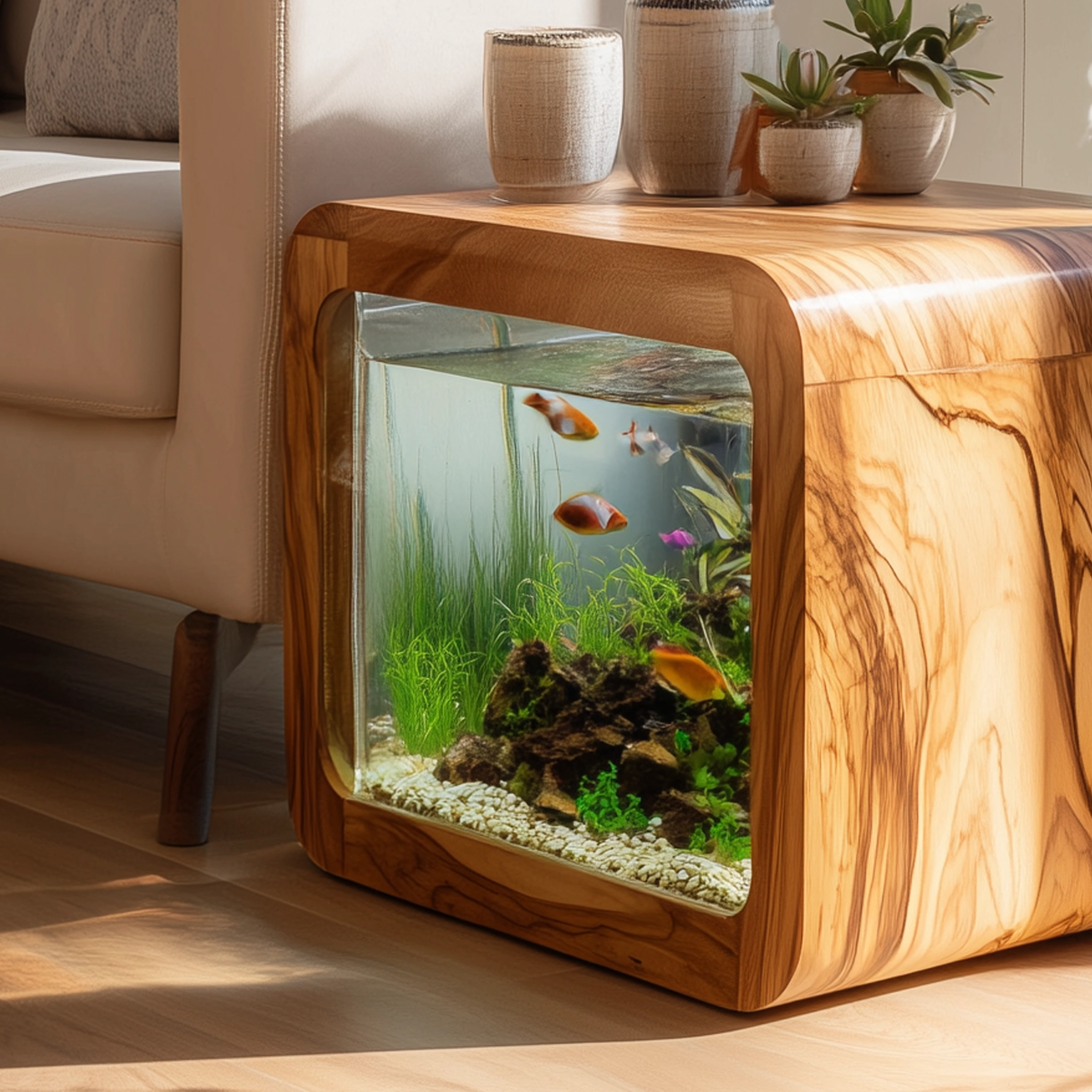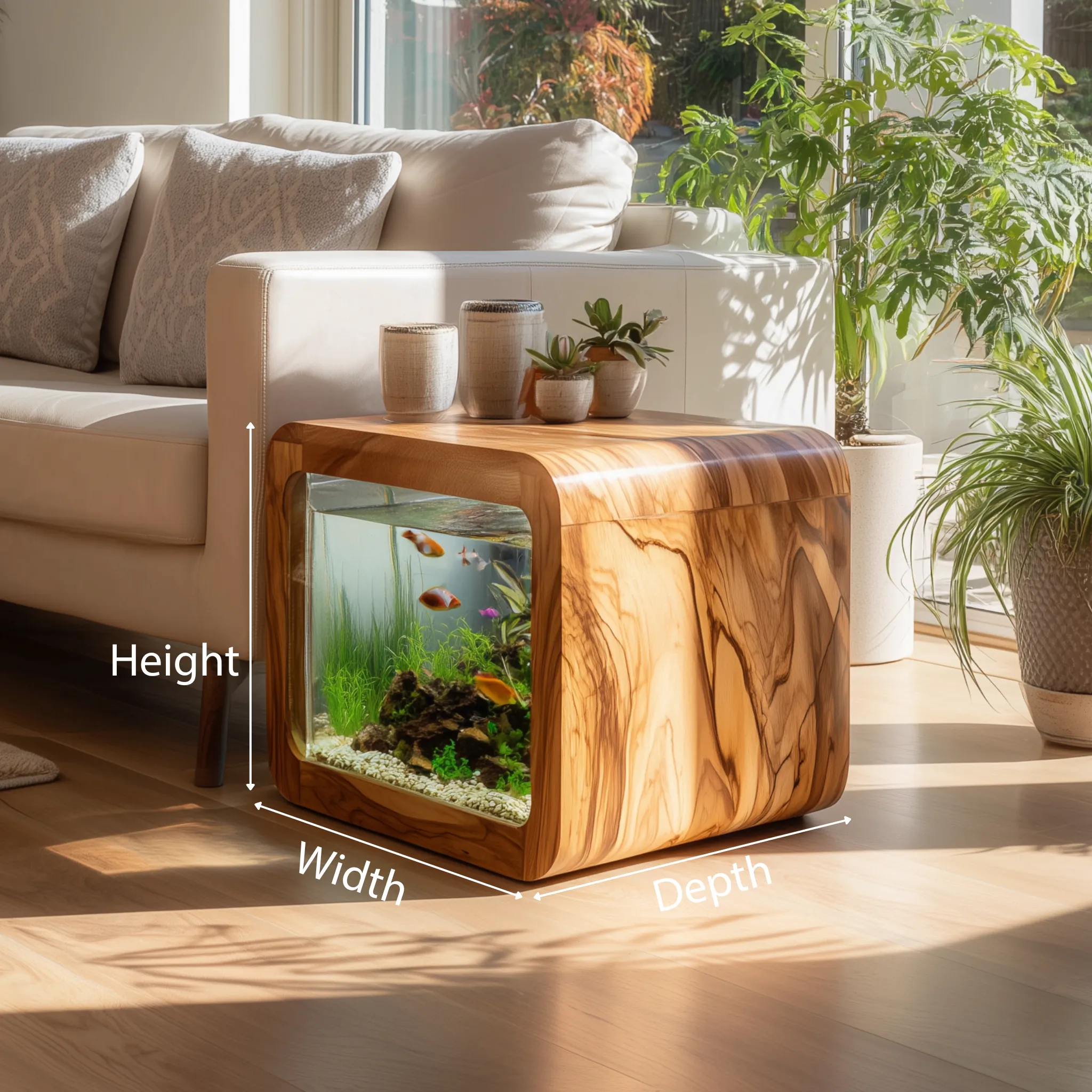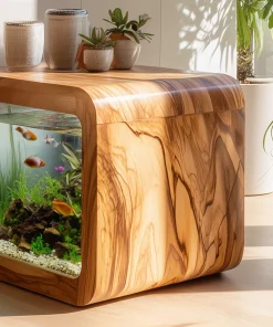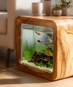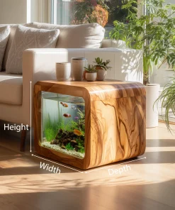 The Wooden Aquarium Side Table with Glass Display Panel is designed as a multifunctional furniture piece that combines a compact side table form with a built-in aquarium display. Its cube-shaped structure allows it to function as a decorative surface while visually showcasing aquatic elements within indoor living spaces.