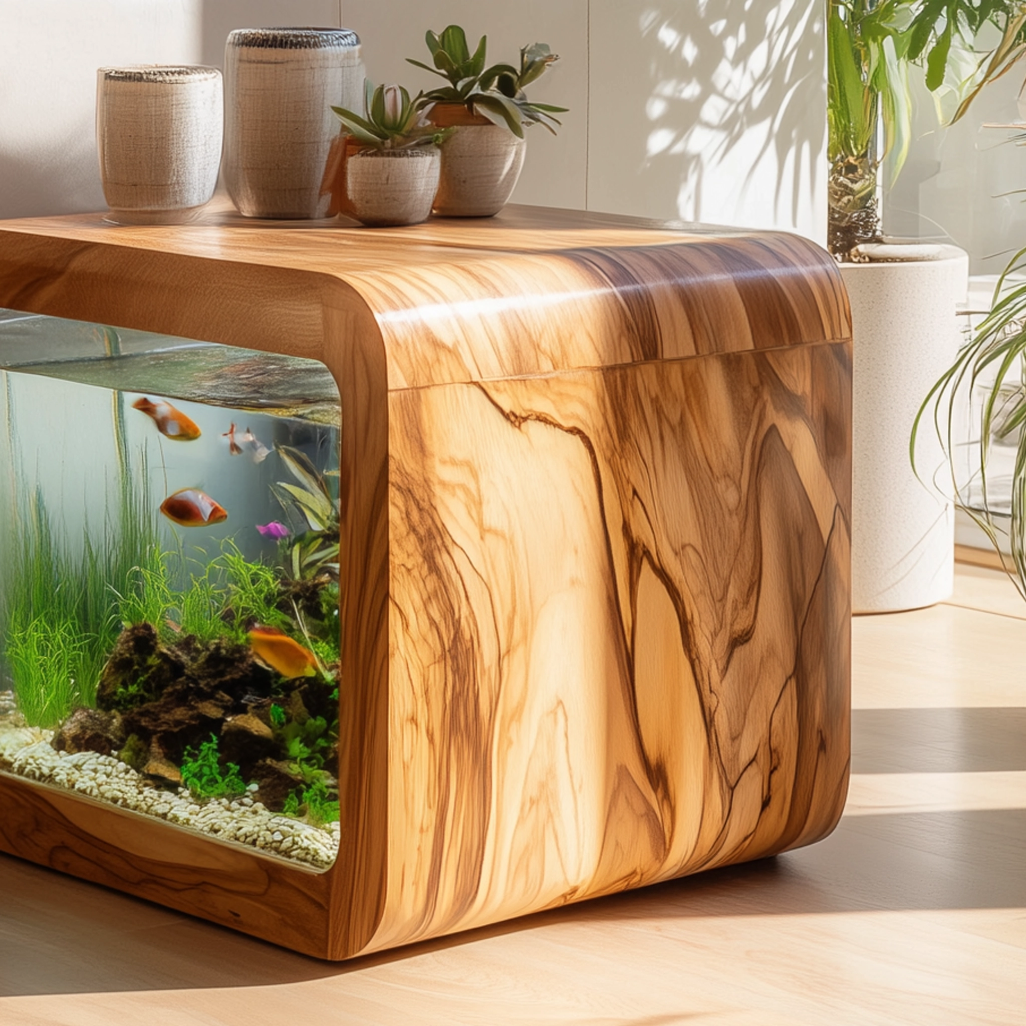 A clear glass panel on the side reveals the interior aquarium area, creating a visual focal point that adds movement and natural interest to the room. The aquarium is presented as a display feature rather than a standalone tank.