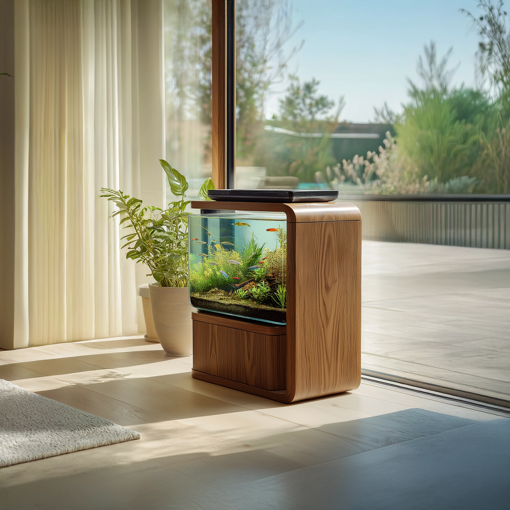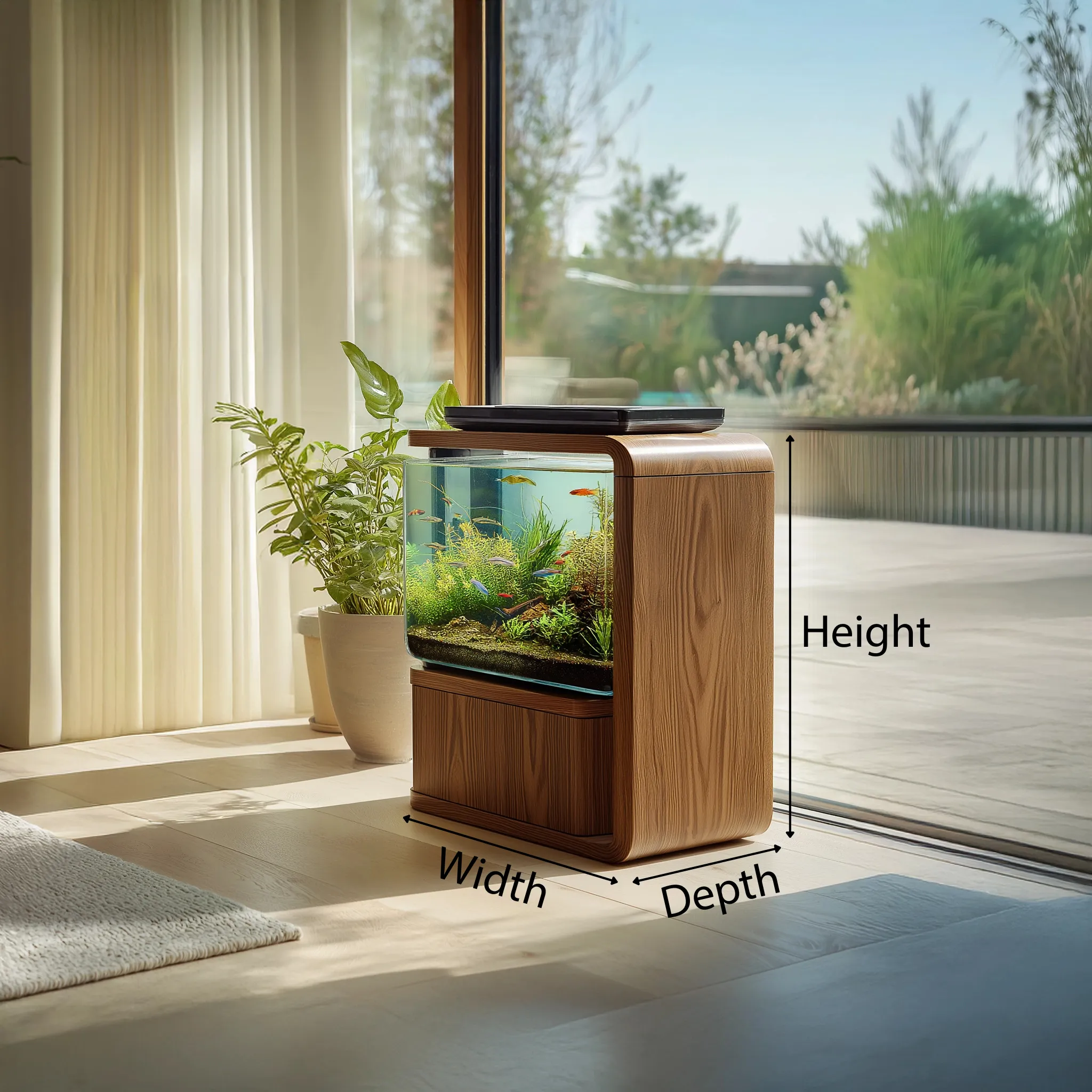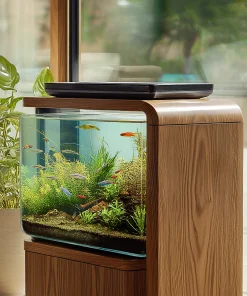 Designed for indoor use, this cabinet-style aquarium piece blends aquatic visuals into everyday living environments without appearing as a standalone tank.