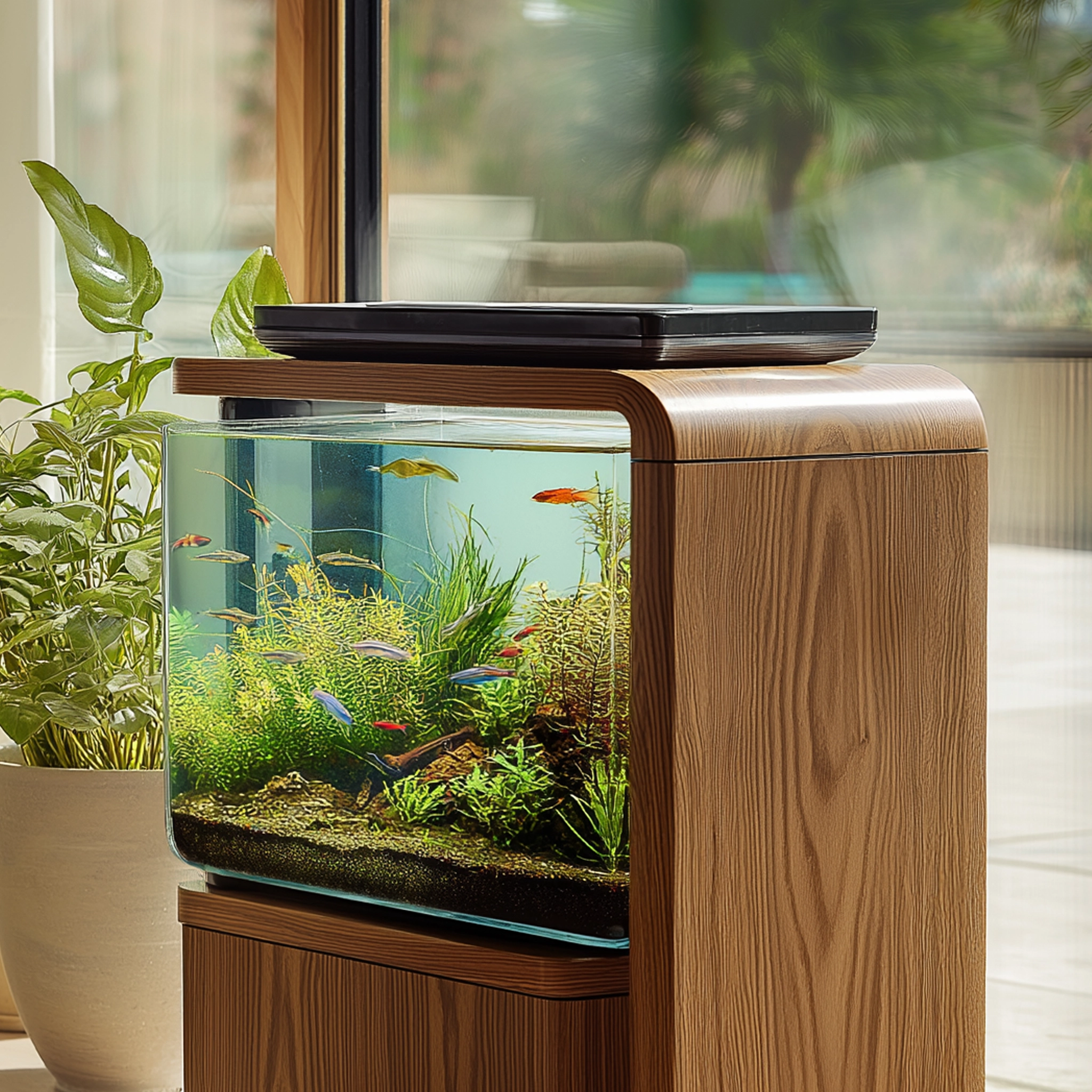 A clear glass window is positioned at the front of the cabinet, offering a direct view into the aquarium interior. This creates a calm visual focal point while maintaining a clean, furniture-style appearance.